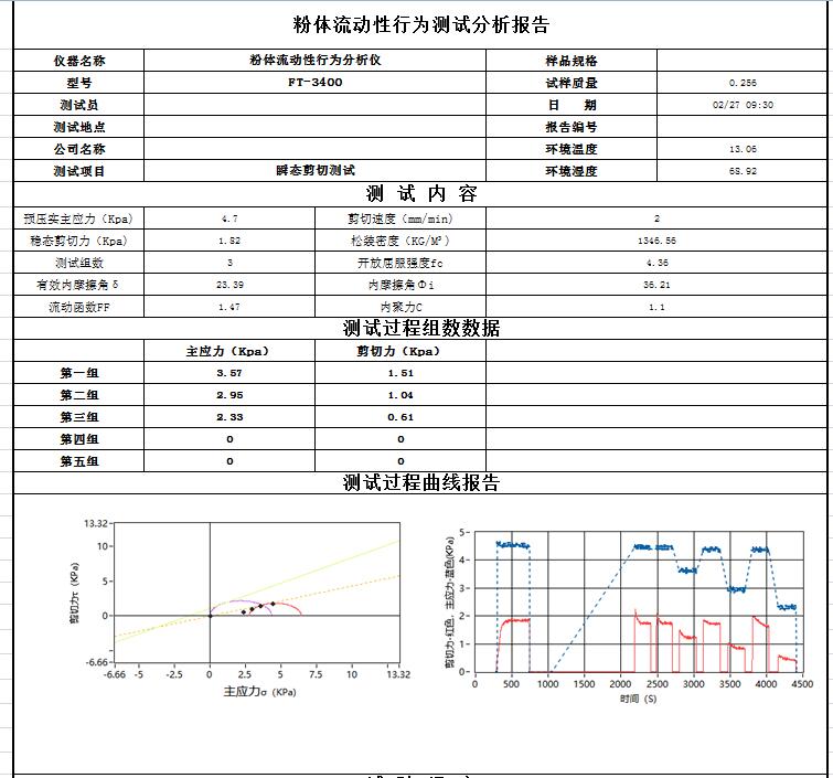分析和測試如下數(shù)據(jù):莫爾應力圓、內(nèi)摩擦角、主應力、剪切力、屈服軌跡、穩(wěn)態(tài)流、流動函數(shù)、開放屈服強度(無側(cè)限屈服強度)、內(nèi)摩擦時間角、時效屈服軌跡、堆積密度、密度軌跡、壁摩擦角、附著力、壁剪切力、壁應力、壁軌跡、運動摩擦角、靜態(tài)摩擦角、料倉設(shè)計的料斗半頂角、卸料口徑、流與不流判定、流動因子、初始抗剪強度(內(nèi)聚力)等數(shù)據(jù)分析.
