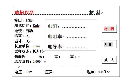 屏液晶顯示:電阻、電阻率、方阻、溫度、單位換算、溫度系數(shù)、電流、電壓、探針形狀、探針間距、厚度 、電導(dǎo)率Large screen LCD: Resistance. resistivity. sheet resistance. temperature. unit conversion.temperature coefficient. current. voltage. probe shape. probe spacing. thickness. conductivity |
