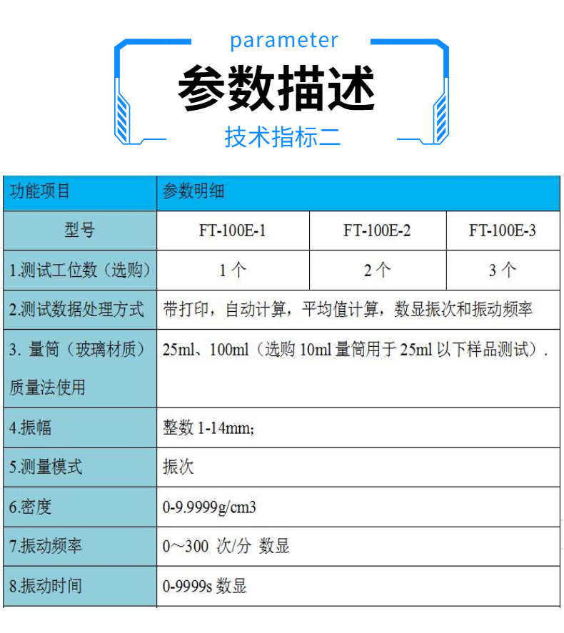 將粉末量筒固定在機械振動裝置上,振動電機帶動機械振動裝置上下振動,裝有粉末的刻度量筒隨機械振動裝置而發生有節拍的振動,隨著振動次數的增加,量筒里的粉末逐漸振實,振動次數到達設定的次數后,機械振動裝置停止振動,讀出刻度試管的體積,根據密度的定義:質量除以體積、從而求出振實后的粉末密度。